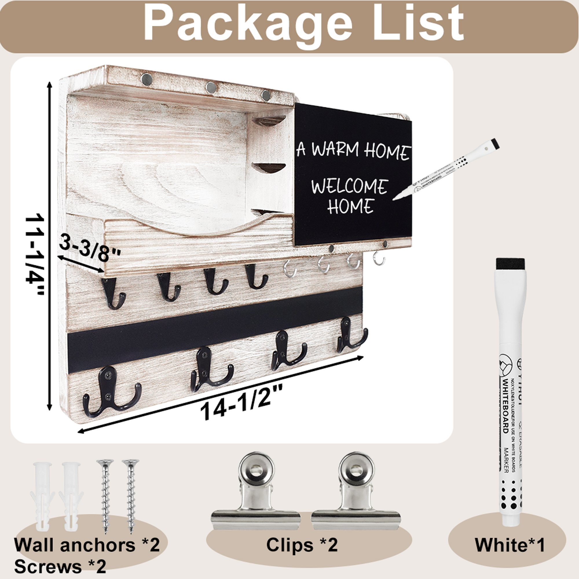HEKOOLA Farmhouse Key and Mail Holder for Wall Decorative, Rustic Mail and Key Organizer for Wall with Different Hooks, Blackboard, Basket, Clips(Pine Wood, White)